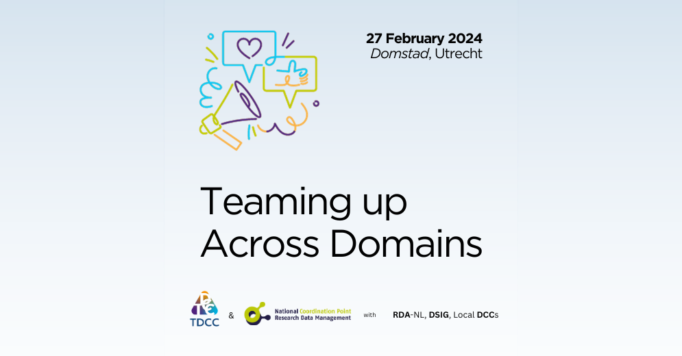 On 27 February the three Thematic DCCs (Life Sciences & Health (LSH), Social Sciences & Humanities (SSH), Natural & Engineering Sciences (NES)) and the LCRDM (National Coordination point of Research Data Management) organized a large event with the theme “Teaming Up Across Domains”. Teaming up with the Research Data Alliance NL (RDA-NL), the Data Steward Interest Group (DSIG), and Local DCCs, the day focused on making progress through collaboration with hands-on sessions and ample networking opportunities. It was a phenomenal event with well over 200 participants, filled with community-led workshops, an inspiring keynote speaker, flash talks demonstrating community initiatives, and a rather informal and welcoming atmosphere.